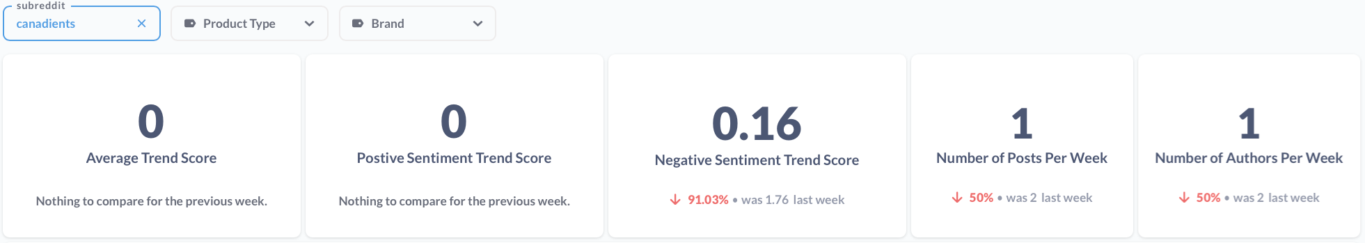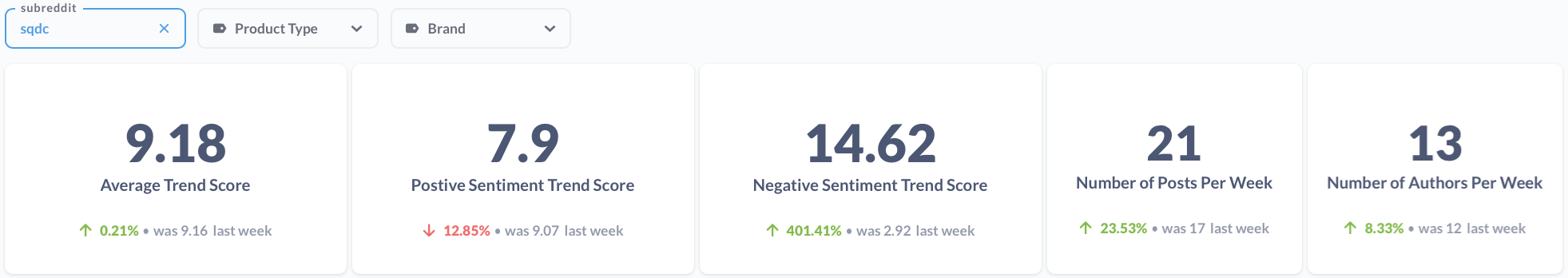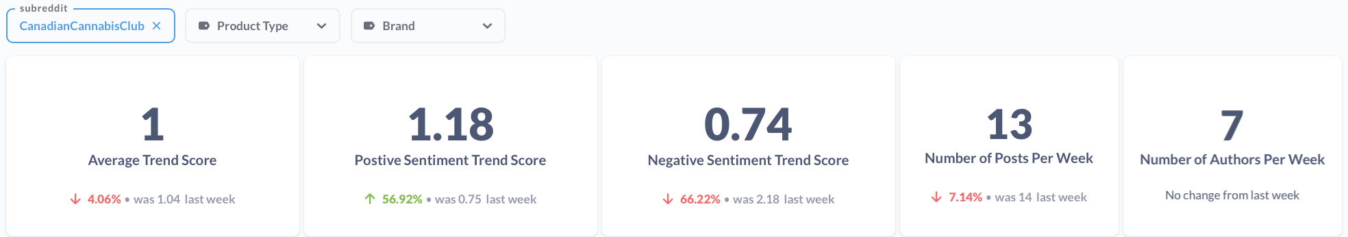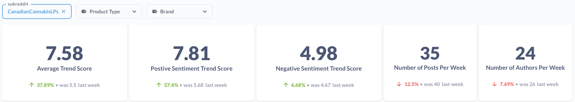 Curious about ongoing changes? Visit the live BudTrendz dashboard to track trend scores and sentiment—positive or negative—across every subreddit, product type, or brand. Customize your view to see what matters most in real time and discover exactly what’s resonating with cannabis consumers.