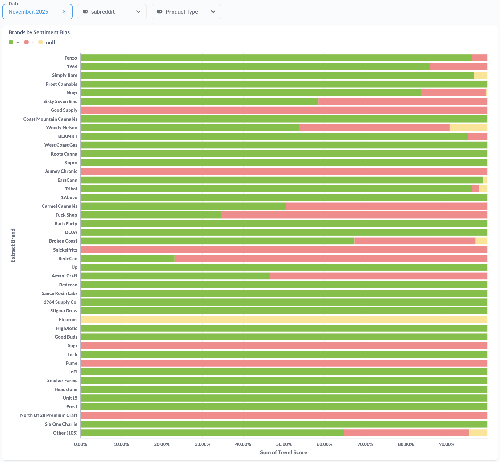 Tenzo dominates the month with massive volume and extremely high positive sentiment. The most notable insight is the Sentiment Bias—while brands like Simply Bare and Frost Cannabis managed to avoid any measurable negative sentiment this month, volume giants like Sixty Seven Sins and Woody Nelson saw a significant split, with nearly 40% of their trend score driven by negative or critical discussions.