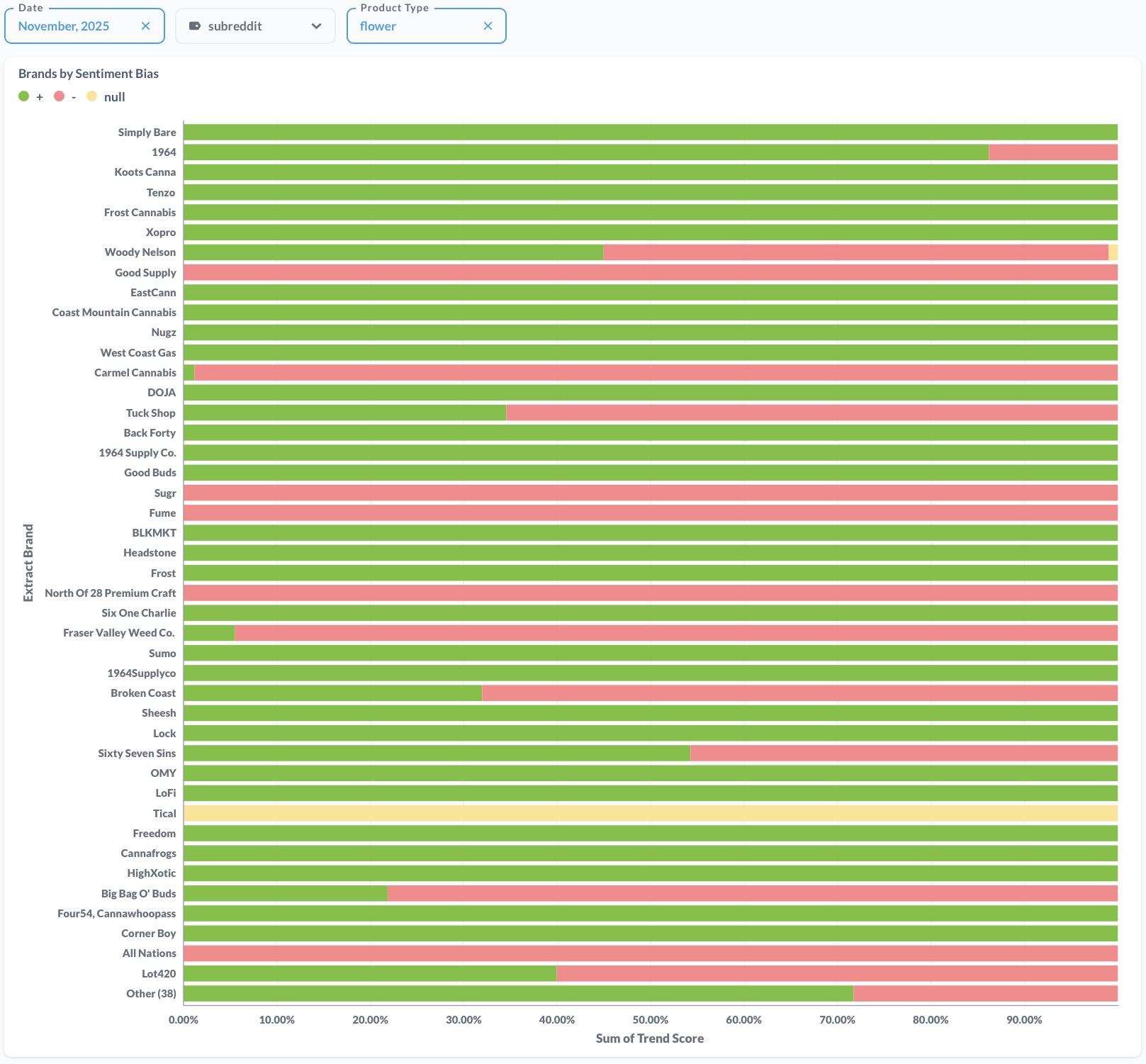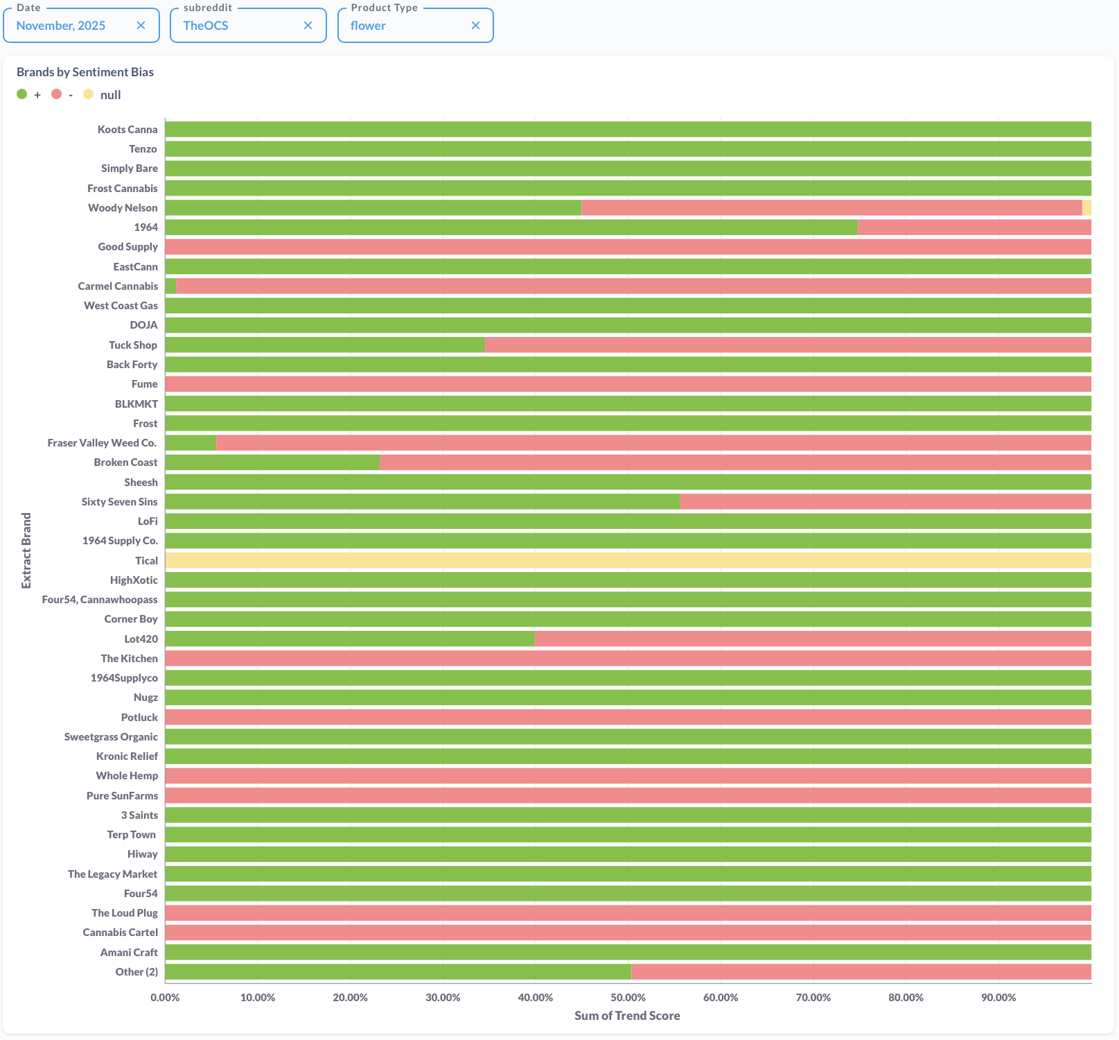 On Canada's largest cannabis subreddit, Woody Nelson remains the most discussed flower brand, but the conversation is heated (4.5 sentiment). Koots Canna and Tenzo are the community darlings this month, generating significant volume with perfect sentiment scores.