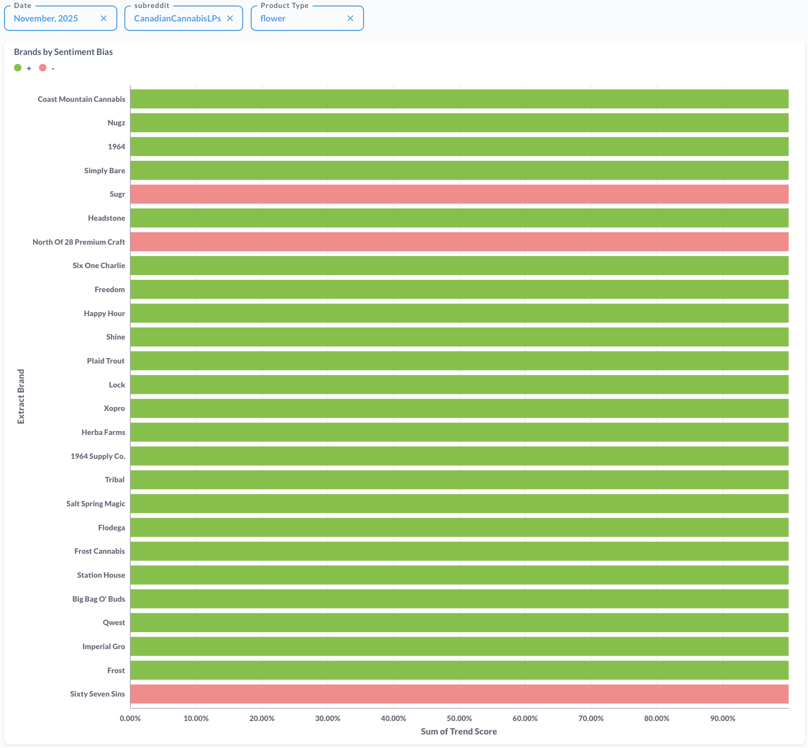 Conversely, the data highlights a massive opportunity for consistency. Brands like Simply Bare, Frost Cannabis, and Coast Mountain Cannabis are proving that it is possible to maintain a flawless reputation—but it requires execution perfection. The "Sentiment Bias" metric is the new scorecard; in a market where volume is contracting, positive sentiment is the only currency that matters.