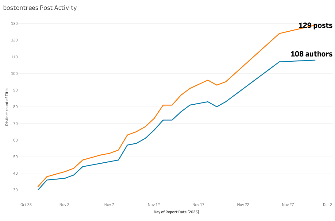 | r/bostontrees | 129 | 108 | Mid Volume / Steady State |